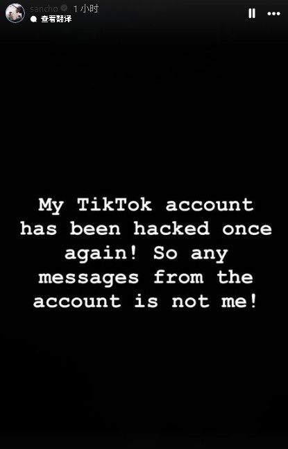 桑乔写道:“我的TikTok账号又一次被盗了!所以任何来自该账号的消息都不是我本人发的!”